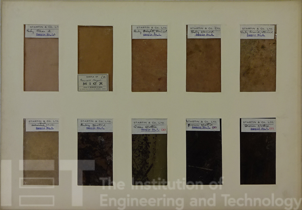 The report refers to this collection of micas prepared from materials supplied by Messrs F Wiggins & Sons and Messrs Startin & Co and said that the collection had been presented to the IEE.