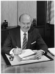 Corfield, Sir Kenneth, seated at desk, signing papers