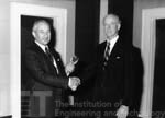 Farley, Professor M G, on left, receiving glass from Lukley, on right