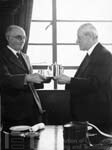 Timms M C (pictured on left) receiving a gift from Sir Geoffrey Clarke