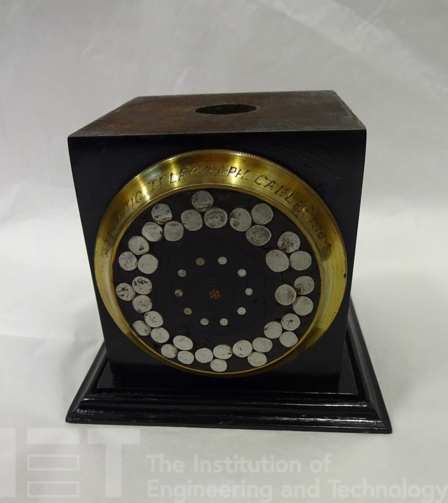 The cable has been set in a brass ring and mounted on a wooden block probably intended as a presentation gift. The words inscribed on the brass ring are ‘ATLANTIC TELEGRAPH CABLE 1864’.